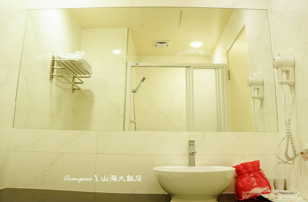 有著一大片的玻璃 旁邊是壁掛式吹風機 備有毛、浴巾